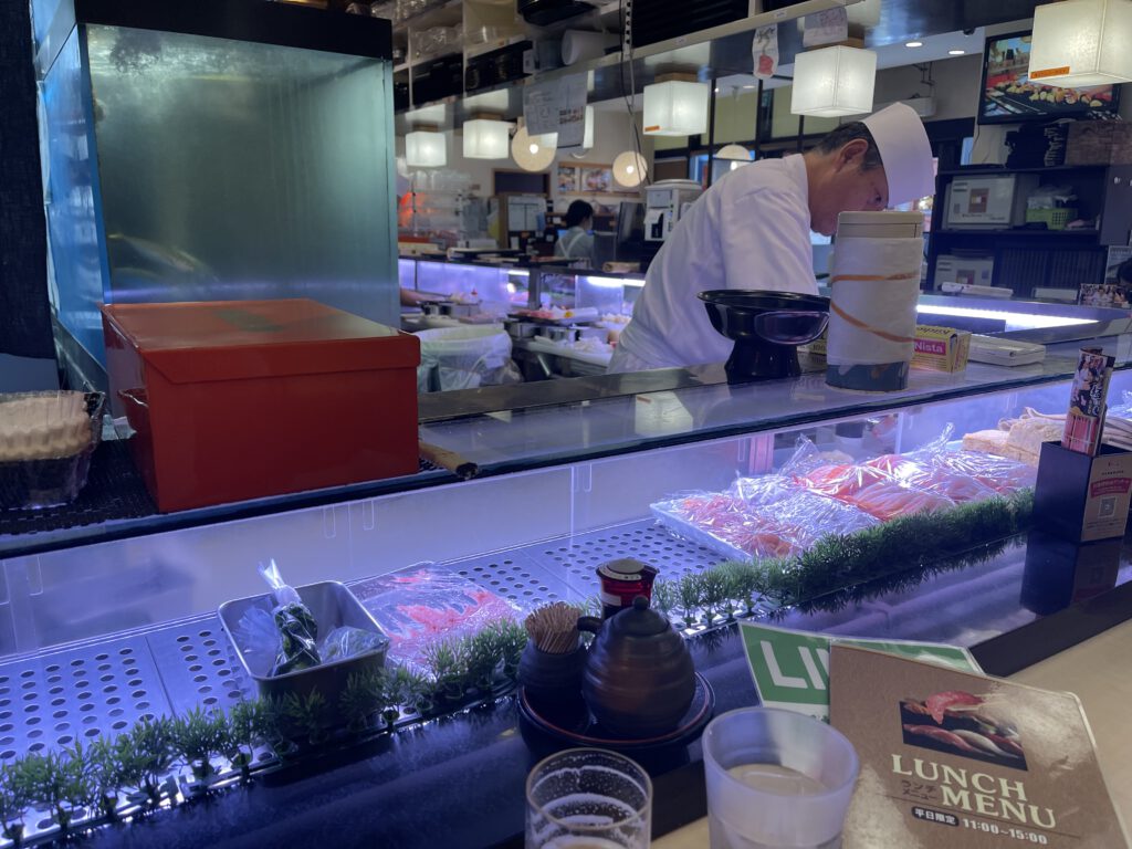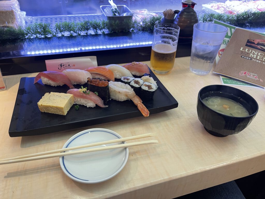 Ein spontanes Sushi (die Platte mit Misosuppe, Bier und Nachspeise haben 11€ gekostet, das freut das Budget (das Kobe-Rind kommt ja noch…).