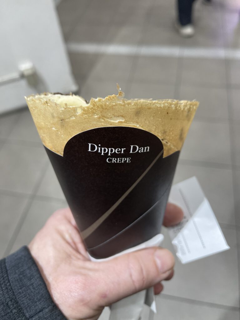 Nachdem ich dann noch einen Crepes von Dipper Dan hatte (Schokolade mit Mandeln) gings heim zur base. Auf dem Weg noch das Abendessen gekauft (gebratener Reis, Schnitzelchen in Bierdeckelform und spicy chicken) und gerade in Ruhe aufm Zimmer gegessen.